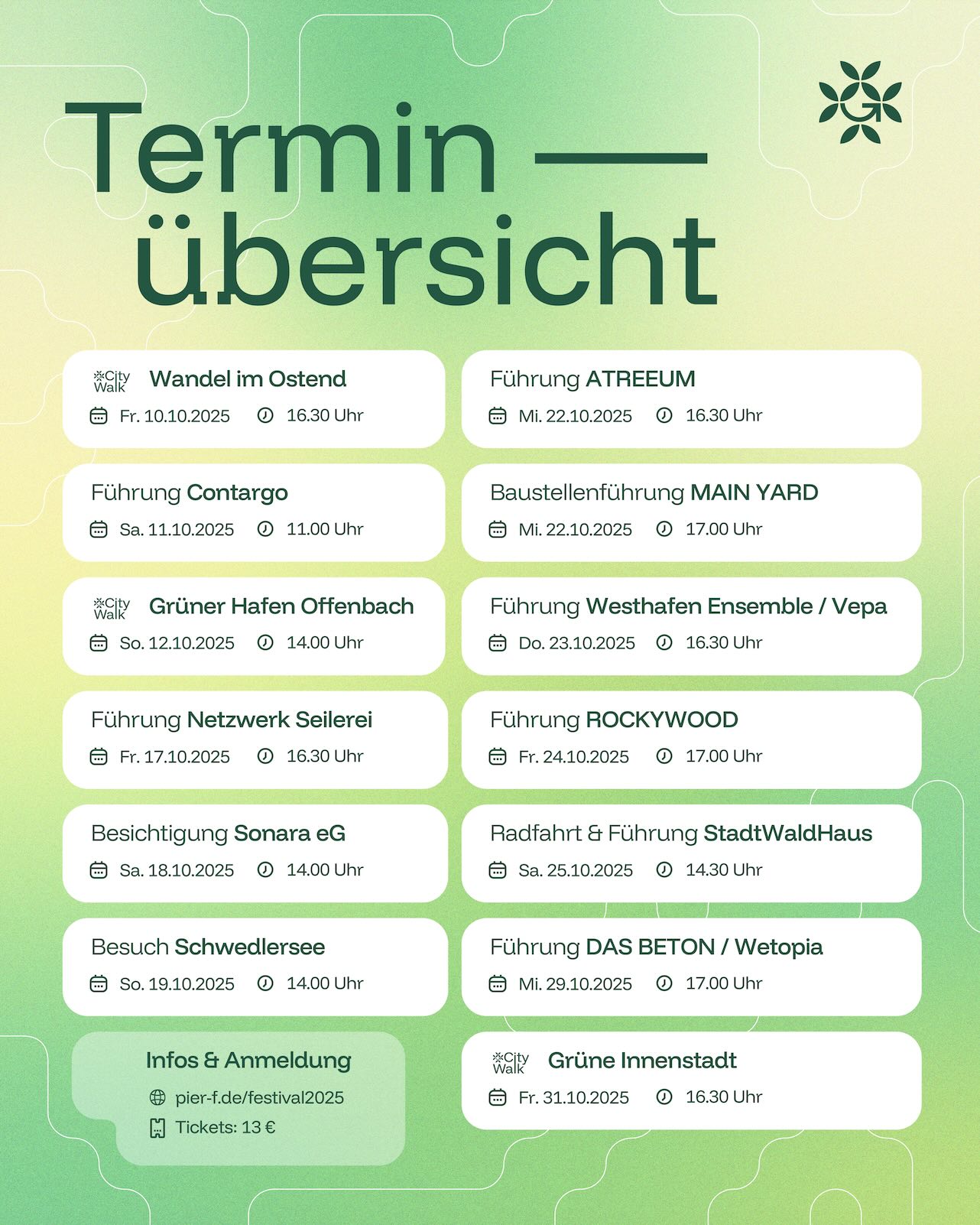 Es gab länger nichts von uns zu lesen, doch heißt das nicht, dass wir untätig waren. In diesem Jahr feiern wir mit AiD – Architektur im Dialog und unserem Nachhaltigkeitszentrum PIER F 15- und 10-jähriges Jubiläum. Das haben wir zum Anlass genommen, ein besonderes Festival zu organisieren, das unsere Arbeit vorstellt und die Bedeutung von grüner Baukultur und nachhaltiger Stadtplanung für eine lebenswerte Zukunft unterstreicht. „Exploring the Green City“ heißt das Ganze und erstreckt sich über den gesamten Oktober. Auf dem Programm stehen drei „Green City Walks“ (FFM-Innenstadt, FFM-Ostend, Hafen Offenbach) und zehn Führungen zu spannenden Projekten, an denen sich unterschiedliche Aspekte der Stadt der Zukunft aufzeigen lassen.