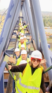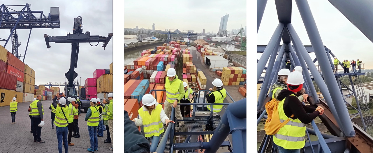 Die Besucherinnen und Besucher dankten es ihm mit vielen interessierten Nachfragen. Anschließend durfte die Gruppe, gewappnet mit Westen und Schutzhelmen, ein Containerterminal erklimmen und die ungewöhnliche Aussicht auf den Betrieb im Osthafen und die Skyline in der Ferne genießen.