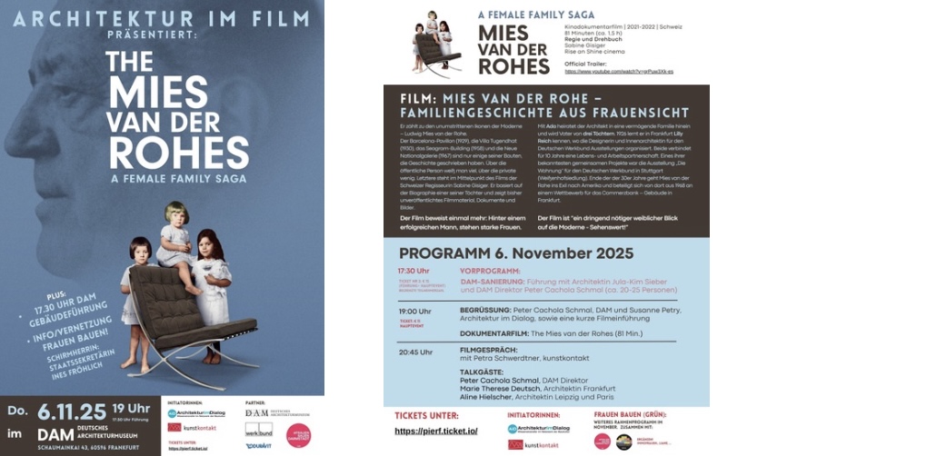 Do. 6.11.2025, 19 Uhr, Architektur im Film: „The Mies van der Rohes – A Female Family Saga“ Es folgt die nächste Ausgabe unserer beliebten Reihe „Architektur im Film“. Im Mittelpunkt des Abends am 6.11.2025 steht der Film „The Mies van der Rohes: A Female Family Saga“, den wir in Zusammenarbeit mit kunstkontakt und dem Deutschen Architekturmuseum zeigen. Das 81 Minuten lange Dokumentarwerk der Schweizer Regisseurin Sabine Gisinger basiert auf der Biografie einer der Töchter des berühmten Architekten Mies van der Rohe, zeigt bisher unveröffentlichtes Bildmaterial und wird als „dringend nötiger weiblicher Blick auf die Moderne“ gefeiert, als Beweis, dass hinter einem erfolgreichen Mann starke Frauen stehen. Mit kurzem Einführungsvortrag und anschließender Gesprächsrunde, für Interessierte gibt es vorweg eine Führung zur Sanierung des DAM.