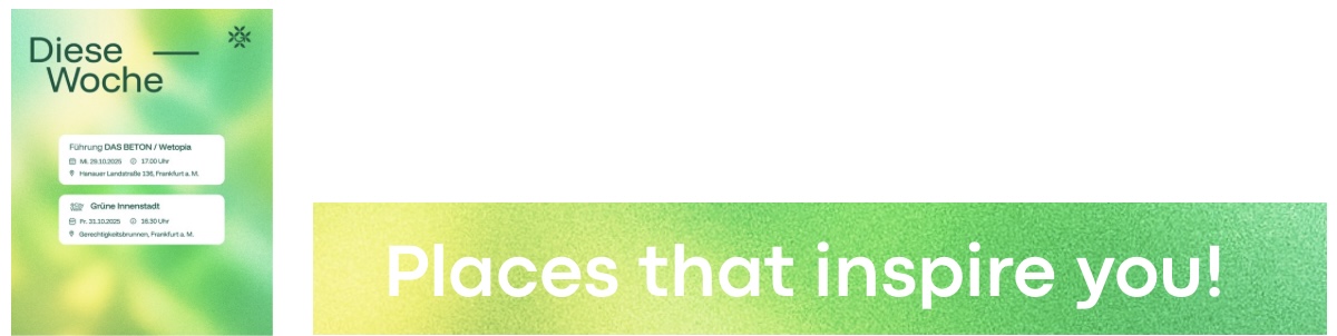 - Mi 29.10., 17–19 Uhr: Führung DAS BETON/Wetopia - Fr 31.10., 16.30–18.30 Uhr: Green City Walk FFM-Innenstadt
